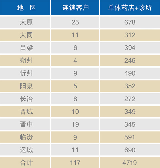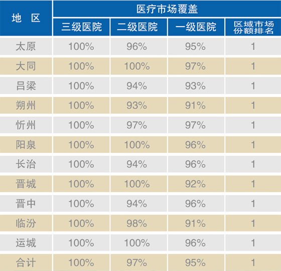 公司的药品配送营销网络已覆盖全省、市、县(区)级以上医疗机构、民营医院、社区诊所、乡镇卫生院,形成了以太原为主体、遍布全省各地、优势突出的药品销售网络。